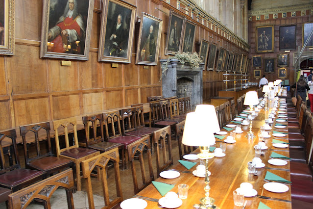 Dicho todo esto como excusa, os voy a contar algo, que ya toca. Este verano estuvimos en Oxford aprovechando la consabida visita a las Islas. Yo había estado de pequeña, en los 80 y por supuesto no me acordaba de nada. El motivo principal para visitarlo no era solo el de conocer la ciudad, sino el de tratar de encontrar algunas de las localizaciones de las películas de Harry Potter. En particular de la primera, 'Harry Potter y la piedra filosofal'. Una de las secuencias más conocidas se rodó en una de los colegios universitarios más espléndidos de la ciudad. Estoy hablando de Christ Church que se fundó a principios del siglo XVI en tiempos de Enrique VIII. El monarca insistió en que la capilla del colegio se convirtiera en la catedral de la ciudad, siendo por este motivo única en el mundo. El College Hall de Christ Church, esa gran sala con largas mesas de madera pulida e impresionantes retratos (incluido el de Lewis Carroll que estudió y enseñó allí) sirvió de inspiración para la versión cinematográfica del comedor de Hogwarts. Así mismo la secuencia en que la profesora McGonagall da la bienvenida a los alumnos de primer curso a Hogwarts se rodó en la escalera principal de Christ Church que lleva justamente al gran salón.